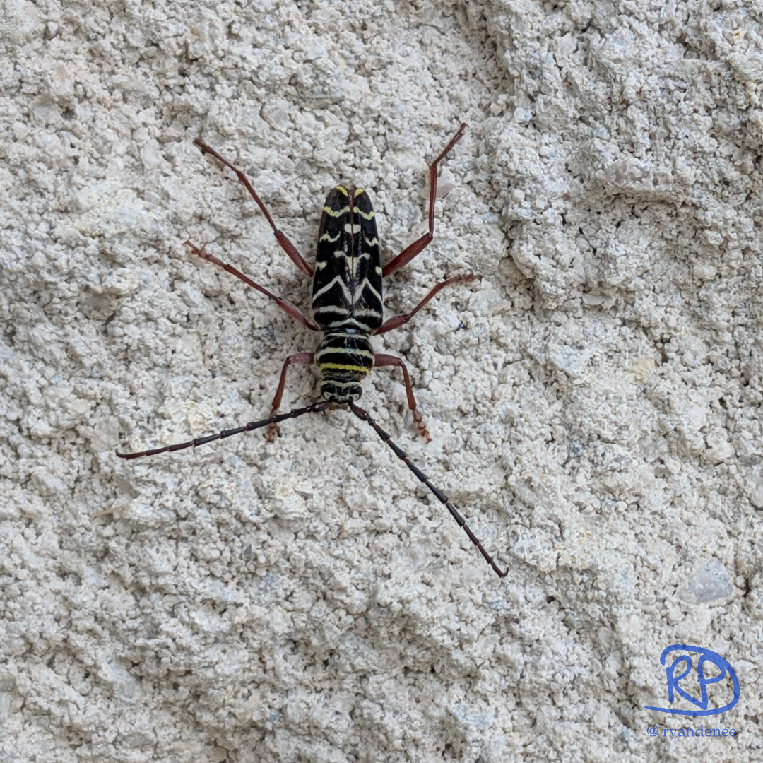 Jet black with yellow bands and a distinctive W-shaped marking across the wing covers. Reddish legs. Long black antennae. Adults run about 2–3 cm long and are active from April through June, most visible on sunny afternoons when the wood is warm.